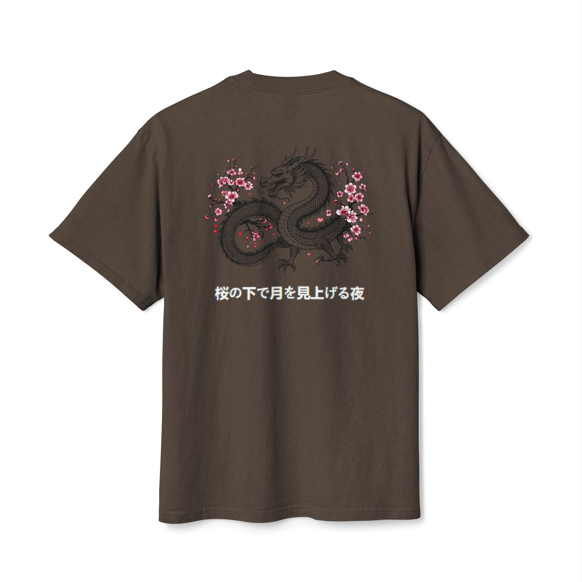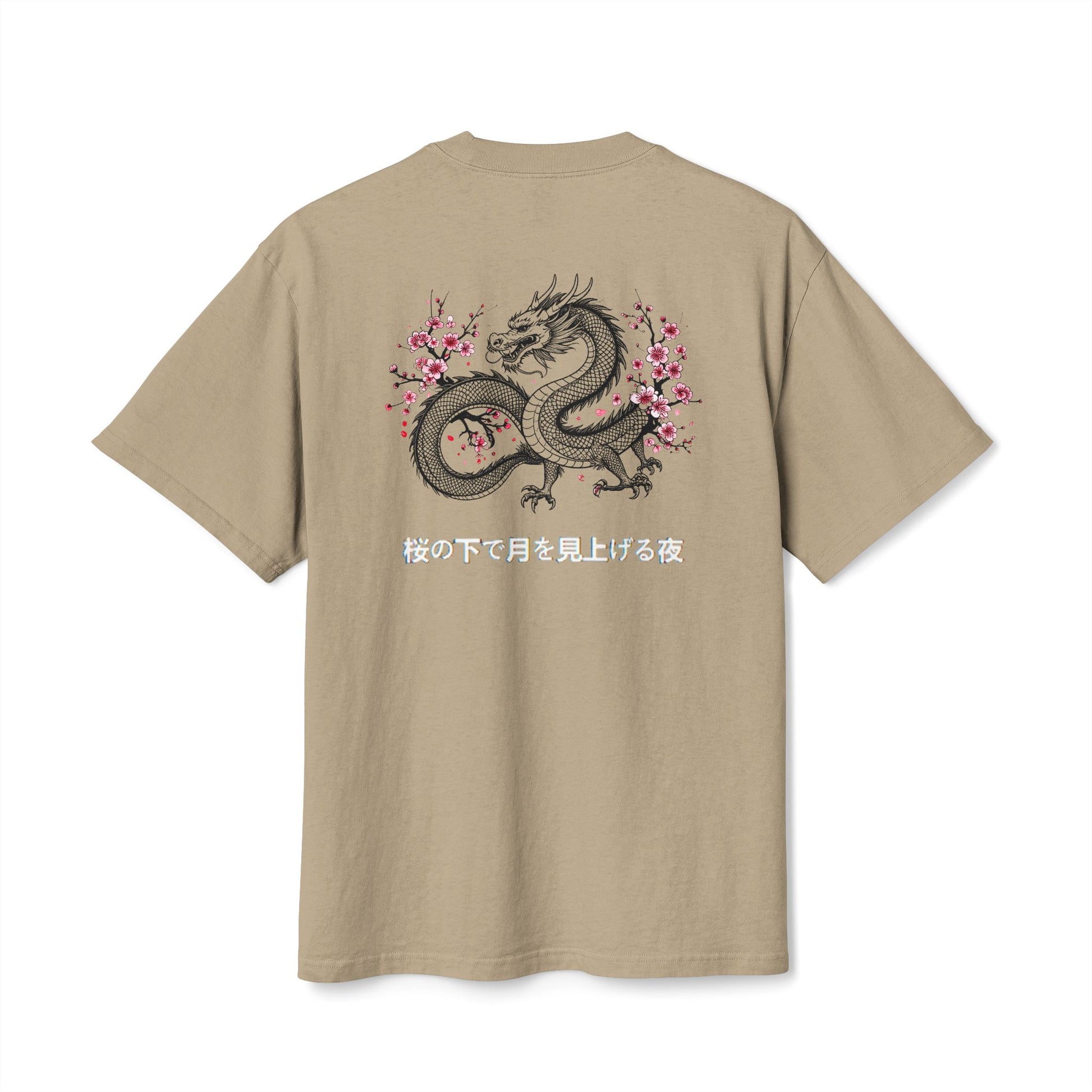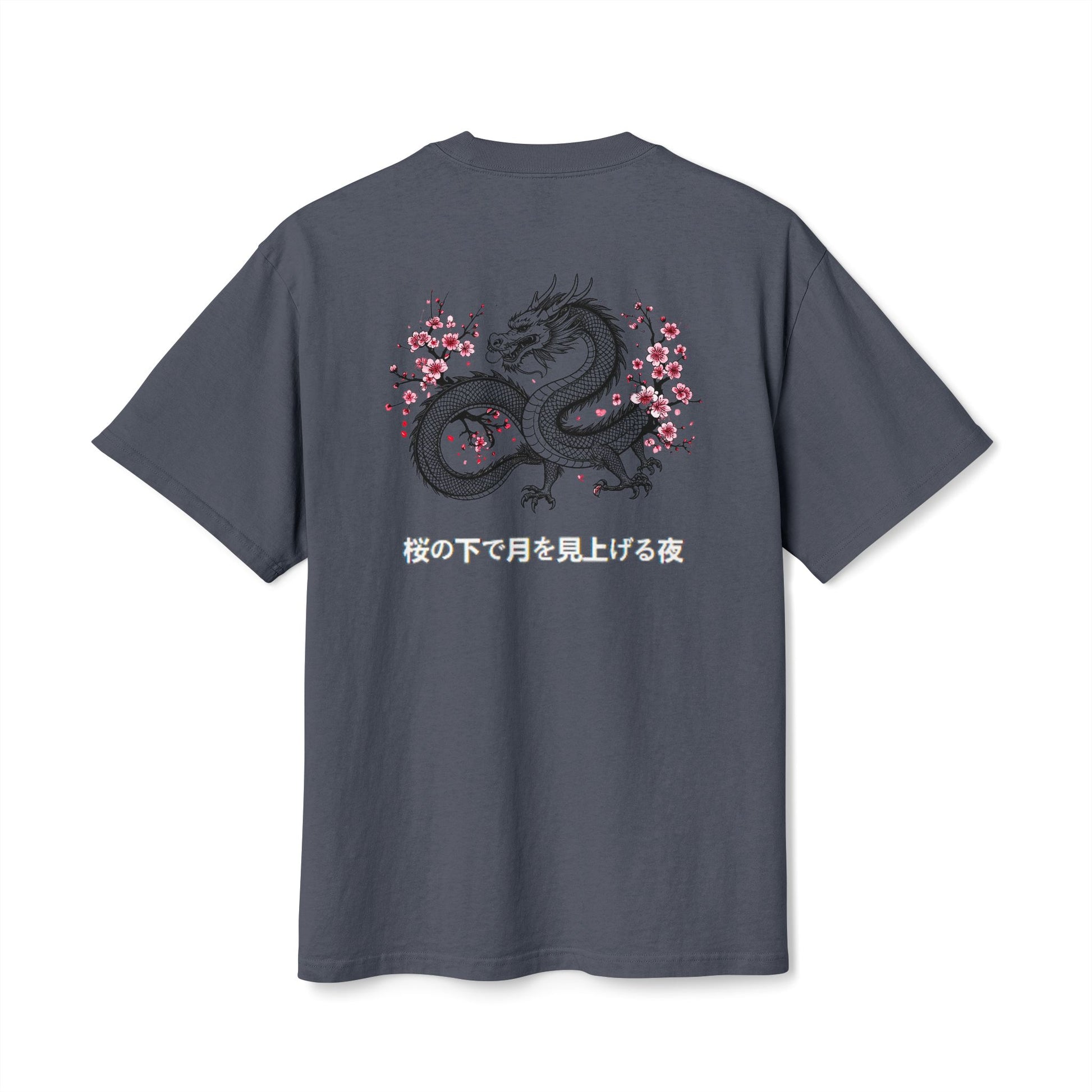 An oversized, faded heavyweight tee built for laid-back days and quiet confidence. The soft, 100% carded cotton has a lived-in feel from its post-sew dyeing, so edges fade naturally and each shirt may show slight hue variation. A bold back graphic — a sinuous East-Asian–inspired dragon coiled among delicate cherry blossoms — adds contrast and story, while a small, subtle mark on the chest keeps the front minimal. Dropped shoulders and a boxy cut give roomy movement. Thoughtful details like shoulder-to-shoulder twill tape, double-needle stitching, and a ribbed collar keep the silhouette stable and durable. Tear-away label and adult sizing make it comfortable to wear and easy to personalize with optional embroidery.